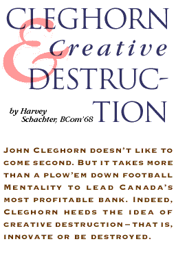 John Cleghorn, BCom'62, was part of the fabled 1960 McGill team that won the national championship under star quarterback Tom Skypeck, DDS'63. The team was runner-up the next year. The fiercely competitive Cleghorn doesn't intend to finish second again. As chairman of McGill's recent fundraising campaign, he raised the most ever for a Canadian university, $205 million--some $5 million over the goal‹one many thought was unattainable given a recession and referendum. And since Cleghorn took the helm of the Royal Bank just over than two years ago, he has led the bank to profits of $1.43 billion--the highest ever recorded by a Canadian company.