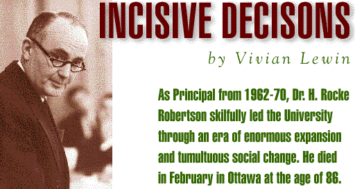In 1962, Robertson left his distinguished surgical career to become Principal and Vice-Chancellor of McGill. Albert Tunis, BA'48, was editor of the McGill News during Robertson's tenure and recalls David Thomson, then dean of graduate studies and research, quipping that Robertson had exchanged making "decisive incisions" for making "incisive decisions."
