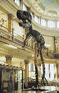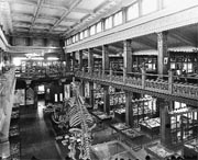 | A view from the upper gallery, showing the original layout of exhibition cases. The side areas have since been walled off to create staff offices and storage space for artifacts not on display. The large skeleton is a cast of the British Museum's Megatherium, a giant ground sloth from the Pleistocene era. |   |