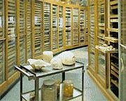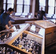 | Grad student Temsin Rotheray at work on a fossil in a basement laboratory. The museum's paleontology collection includes 100,000 invertebrates from the St. Lawrence lowlands, 30,000 paleobotanical fossils from eastern Canada and 10,000 vertebrate specimens, as well as casts of early reptiles and amphibians. |   |