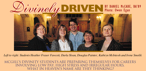 Their academic ability is scrutinized, as are their leadership and counselling skills. Psychologists probe their psyche to determine their mental fitness for the ministerships they seek. "One of the things you're judged on is how well you integrate all those aspects," says Kathyrn McIntosh, a candidate for ministry in the United Church. "You can't get away with compartmentalizing.You can do extremely well in the academic aspects of your training and still be refused in the end." The program isn't for the faint of heart. "You don't come here and get the fuzzies," says Smolik. "You know how people talk about throwing babies into the water so they'll learn how to swim? That's the way it feels sometimes." The ordinands like the fact that the Faculty of Religious Studies is part of a greater, very diverse McGill community. "It's more representative of the milieu in which we'll be working," says Sloan. "Society tends to be secular. You learn to be respectful of other people's views."